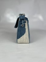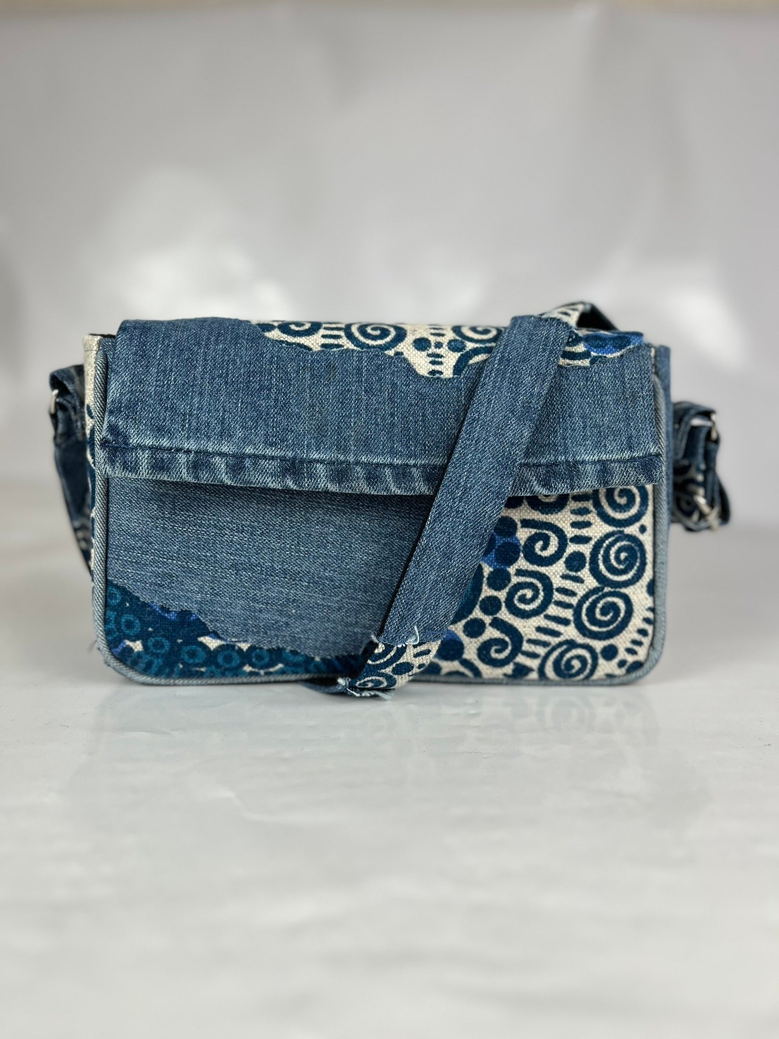 Comfortable to wear over the shoulder, this unique denim bag combines sustainability with functionality. Each piece is one-of-a-kind due to the nature of repurposed materials.